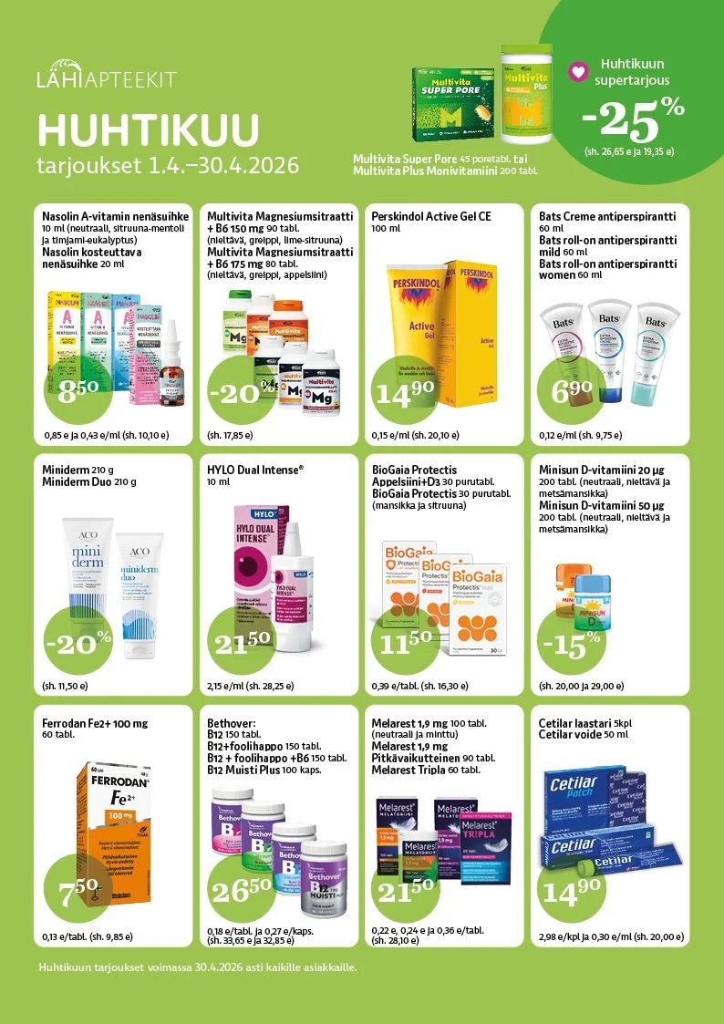 Valikoimassamme on ACOn ja Avènen apteekkikosmetiikkaa. Jos sinulla on tuotetoiveita valikoimaamme, saamme tilattua monia tuotteita jopa jo seuraavaksi arkipäiväksi.